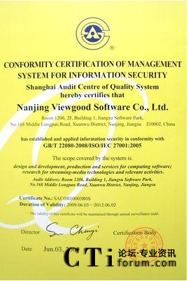 CTI論壇(ctiforum)07月17日消息: 日前,VIEWGOOD順利通過ISO27001信息安全管理體系國際認證,成為首家通過該項認證的專業(yè)流媒體技術供應商。此舉標志著VIEWGOOD在保障信息安全、提升企業(yè)管理水平方面,已經(jīng)全面接軌國際水平,并居于業(yè)內領先地位。