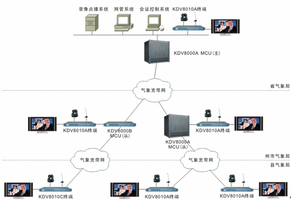 二期工程將實現(xiàn)州市到縣的建設。屆時,州市氣象局既是省氣象局的遠端節(jié)點又是縣氣象局的中心點,可根據(jù)情況部署KDV8000A或KDV8000B多點控制單元,向上與省氣象局多點控制單元級聯(lián),向下與縣氣象局視頻會議終端相連。州市氣象局在一期工程中已配視頻會議終端,因此二期工程僅需在各縣氣象局部署KDV8010A或KDV8010C視頻會議終端各1臺即可,通過氣象寬帶網(wǎng)接入州市氣象局的多點控制單元。