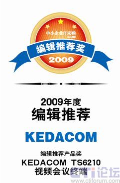 CTI論壇(ctiforum)05月20日消息: 近日,由《中小企業(yè)IT采購》舉辦的2009年度編輯推薦獎評測活動落下帷幕,科達TS6210視頻會議終端以其卓越的視音頻質量、優(yōu)異的網絡適應性、極高的性價比在本次評選活動中脫穎而出,獲此殊榮。CTI論壇報道