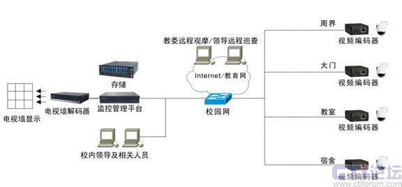 CTI論壇(ctiforum)05月21日消息: 河南欒川職業(yè)技術學校地處偏僻,加強校園安全建設,保障學校師生和校園財產(chǎn)安全是其重要工作。09年初,該學校選擇科達為其部署了一套“平安校園”網(wǎng)絡視頻監(jiān)控系統(tǒng),通過技防實現(xiàn)了全校范圍內(nèi)的安全防范。欒川職業(yè)技術學!捌桨残@”系統(tǒng)拓撲圖