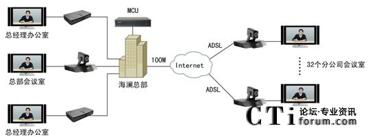 2009年6月,領(lǐng)先的視訊廠商科達(dá)攜TrueSens(致勝)視頻會(huì)議系統(tǒng)走進(jìn)海瀾,為海瀾集團(tuán)搭建了一套覆蓋總部2個(gè)領(lǐng)導(dǎo)辦公室、1個(gè)銷售會(huì)議室及全國(guó)32個(gè)分公司的視頻會(huì)議系統(tǒng)。整個(gè)方案在部署上非常便捷,海瀾江陰總部的機(jī)房架設(shè)一臺(tái)高、標(biāo)清一體化多點(diǎn)控制單元(MCU),銷售會(huì)議室、集團(tuán)王總、陶總的辦公室以及海瀾集團(tuán)在全國(guó)的32個(gè)分公司銷售會(huì)議室則各部署一套視頻會(huì)議終端?偛繋挒100M,分支機(jī)構(gòu)則均通過普通ADSL接入。系統(tǒng)拓?fù)鋱D如下: