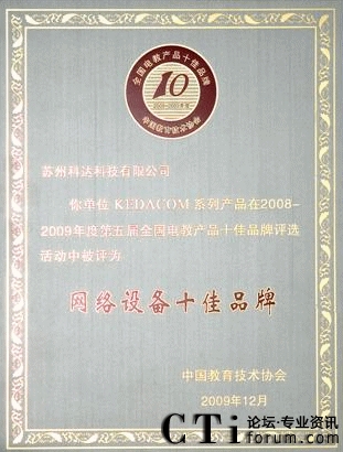CTI論壇(ctiforum)12月14日消息(記者 張塵):2009年12月4日,由國內(nèi)教育權(quán)威機(jī)構(gòu)“中國教育技術(shù)協(xié)會(huì)”主辦,以讀者調(diào)查問卷的形式舉行的第五屆全國電教產(chǎn)品十佳品牌頒獎(jiǎng)典禮在福州梅峰賓館盛大開幕,科達(dá)教育視頻會(huì)議產(chǎn)品憑借卓越的產(chǎn)品性能和良好的客戶服務(wù)入選網(wǎng)絡(luò)產(chǎn)品類十佳之列,同時(shí)也成為首個(gè)入選十佳品牌的視頻會(huì)議產(chǎn)品。CTI論壇報(bào)道