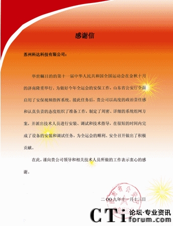 CTI論壇(ctiforum)12月29日消息(記者 張塵):日前 ,山東省公安廳向蘇州科達(dá)科技有限公司發(fā)來(lái)感謝信,對(duì)蘇州科達(dá)為保障全運(yùn)會(huì)順利、安全召開(kāi)所做的貢獻(xiàn)表示衷心的感謝。CTI論壇報(bào)道