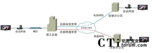 該套視頻會議系統(tǒng)最大的特點就是擁有超強的網(wǎng)絡(luò)適應(yīng)性。由于采用了高效視音頻編碼技術(shù)和大量智能化網(wǎng)絡(luò)適應(yīng)技術(shù),無論是ADSL、光纖還是VPN,均可進行快速接入,并充分保證在Internet環(huán)境下的會議效果。因此,天元置業(yè)此次視頻會議系統(tǒng)就是完全基于公司現(xiàn)有的Internet進行部署的。如圖1。
