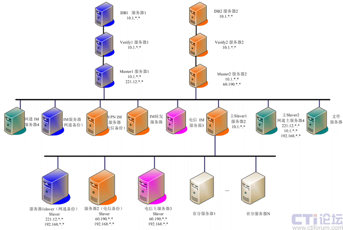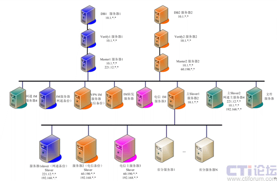 系統(tǒng)基礎(chǔ)平臺(tái)的部署采用4臺(tái)物理服務(wù)器方式實(shí)現(xiàn),四臺(tái)物理服務(wù)器分別有多塊網(wǎng)卡,為不同網(wǎng)絡(luò)用戶(hù)提供不同服務(wù),同時(shí)實(shí)現(xiàn)實(shí)現(xiàn)核心數(shù)據(jù)的冗余、備份。在二級(jí)機(jī)構(gòu),即在省級(jí)每個(gè)省部署一臺(tái)分服務(wù)器,實(shí)現(xiàn)當(dāng)?shù)赜脩?hù)的數(shù)據(jù)轉(zhuǎn)發(fā)等任務(wù),系統(tǒng)部署入下圖所示: