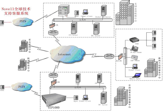 Novell中國技術(shù)支持中心采用融天科技的RT-CCP1000作為呼叫處理平臺,業(yè)務(wù)處理通過Internet用瀏覽器的方式使用美國現(xiàn)有的Siebel CRM業(yè)務(wù)系統(tǒng),作為Novell全球客戶服務(wù)支撐體系的一個分支,響應(yīng)來自全球的客戶服務(wù)。基于IP網(wǎng)絡(luò),系統(tǒng)設(shè)立了遠端座席,為不同地區(qū)的用戶提供本地化、無差異化的服務(wù)。