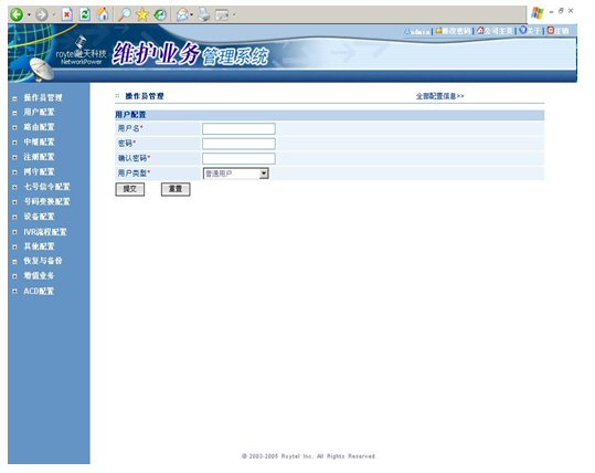 如果說節(jié)省了幾臺服務器和CTI中間軟件的開支對于用戶而言僅僅是一個直觀的體驗,那么RT-CCP1000的維護和管理將對用戶產(chǎn)生長久的影響,在維護和管理上仍然堅持著一體化核心理念的RT-CCP1000平臺,將用戶從多個廠家的設備互聯(lián)和維護中(程控交換機/CTI服務器/IVR服務器/錄音服務器)徹底的解放出來。RT-CCP1000基于WEB方式的全中文操作維護界面始終走在業(yè)界的最前沿。