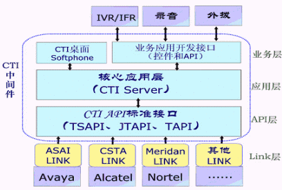 CTI中間件用來在計(jì)算機(jī)應(yīng)用系統(tǒng)和交換設(shè)備之間充當(dāng)接口作用,起著承上啟下的作用;CT中間件向下提供通用性支持(對主要交換機(jī)消息接口和符合CSTA標(biāo)準(zhǔn)的交換設(shè)備的支持);向上提供應(yīng)用接口或開發(fā)控件,包括呼叫控制、座席管理以及其他設(shè)備接口等功能,這些是CT中間件的核心功能。但目前CTI中間件已經(jīng)拓寬了該應(yīng)用范圍,CTI中間件還向上延伸了功能,提供了一部分業(yè)務(wù)應(yīng)用和業(yè)務(wù)管理功能,如業(yè)務(wù)系統(tǒng)、監(jiān)控系統(tǒng)、計(jì)費(fèi)系統(tǒng)、呼叫統(tǒng)計(jì)報(bào)表的應(yīng)用。