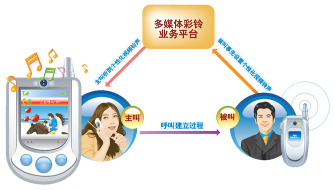 多媒體彩鈴業(yè)務由被叫用戶申請,可以根據(jù)不同的主叫用戶分類提供不同的回鈴流媒體。提供一種基于不同主、被叫的差異化、多媒體鈴音服務。