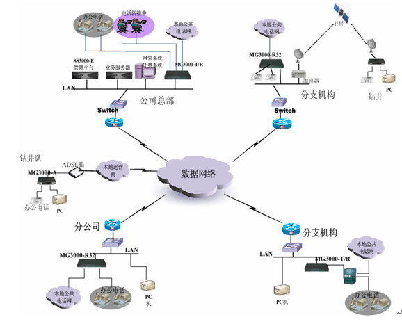 對規(guī)模比較小的辦事處,或者遠端的鉆井隊,一般在本地都是采用ADSL接入這樣方式,這樣情況可以直接配置MG3000-A語音往關(guān),實現(xiàn)語音數(shù)據(jù)同傳方式。MG3000-A提供1、4、8口多種方式供實際情況來選擇。所有的號碼可以直接在總部中心的平臺來分配控制。