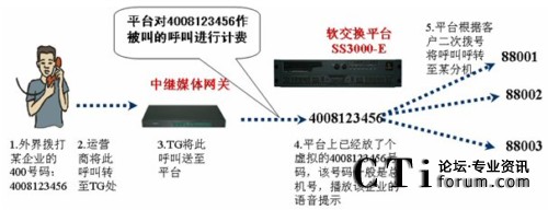 400業(yè)務(wù)又稱(chēng)“主被叫分?jǐn)偢顿M(fèi)業(yè)務(wù)”,即為客戶(hù)提供一個(gè)全國(guó)范圍的400號(hào)碼,并把對(duì)該號(hào)碼的呼叫接至被叫客戶(hù)事先規(guī)定目的地(電話號(hào)碼或呼叫中心)。通常是主叫(撥打400的人)付市話費(fèi),被叫(擁有400號(hào)碼的客戶(hù))付長(zhǎng)途費(fèi)(主叫地區(qū)到目的地之間)SS3000-E適時(shí)推出了支持400業(yè)務(wù)的功能,即“被叫計(jì)費(fèi)”。按照下圖的指示,利用SS3000-E的被叫計(jì)費(fèi)功能,本次通話的費(fèi)用部分計(jì)在了4008123456這個(gè)號(hào)碼上。CTI論壇編輯