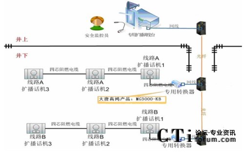 系統(tǒng)采用全分布式控制結(jié)構(gòu)。主要由專用防爆轉(zhuǎn)換器(MG3000-KB)、防爆擴(kuò)播電話機(jī)、隔爆兼本安型電源和專用擴(kuò)播調(diào)度臺(tái)構(gòu)成。專用擴(kuò)播調(diào)度臺(tái)位于地面中央控制室,專用擴(kuò)播調(diào)度臺(tái)與專用轉(zhuǎn)換器之間采用工業(yè)以太網(wǎng)絡(luò)連接,專用防爆轉(zhuǎn)換器與防爆擴(kuò)播電話機(jī)之間采用總線結(jié)構(gòu)聯(lián)接。