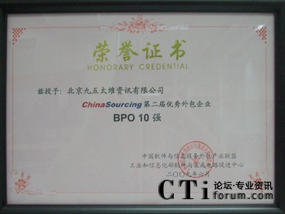 CTI論壇(ctiforum)06月16日消息: 日前,從國家工業(yè)和信息化部傳來喜訊:北京九五太維資訊有限公司2009年蟬聯(lián)“中國BPO企業(yè)10強”。CTI論壇報道