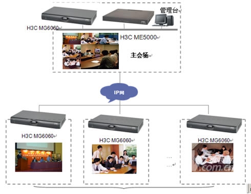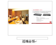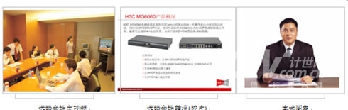 在主會(huì)場,分會(huì)場的會(huì)議室配備H3C高清視訊終端MG6060。H3C MG6060終端支持H.263、H.264等視頻編解碼協(xié)議,并采用了專有的視頻前、后處理技術(shù),使得圖像質(zhì)量大大提升,在周圍環(huán)境光照較差或者會(huì)場顏色搭配不甚和諧的情況下,仍舊能夠得到清晰、自然的圖像。視頻功能主要特色功能包括動(dòng)態(tài)4CIF高清圖像、H.239雙視頻流傳送、畫中畫(PIP)、雙屏顯示、分屏顯示、VGA輸入、VGA輸出、桌面?zhèn)魉、圖像屏蔽、圖像參數(shù)調(diào)整等。有關(guān)H3C