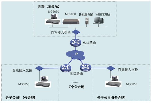 集團(tuán)總部主會(huì)場和各個(gè)分會(huì)場各部署一臺H3C公司的MG6050多媒體網(wǎng)關(guān),同時(shí)支持H.323和SIP協(xié)議,支持H.263/H.264編碼技術(shù)和4CIF高清晰圖像分辨率,最高可以提供2M會(huì)議帶寬。集團(tuán)總部主會(huì)場和各個(gè)分會(huì)場推薦使用Sony