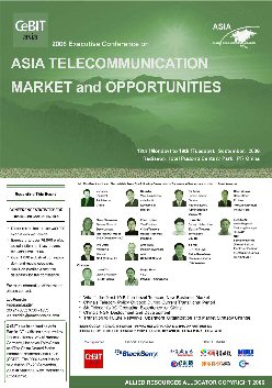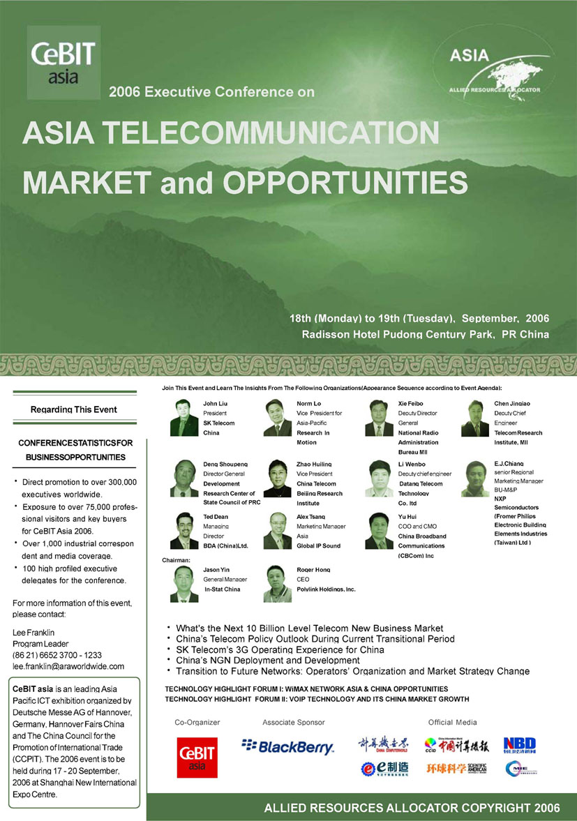 2006亞洲信息及通信技術(shù)展覽會(huì),即亞洲CeBIT展將于今年9月17日至20日在上海新國(guó)際博覽中心召開(kāi)。由中國(guó)國(guó)際貿(mào)促會(huì)電子信息行業(yè)分會(huì)與德國(guó)漢諾威展覽公司聯(lián)合主辦的這一展會(huì),近300家國(guó)內(nèi)外廠商參展,將分為數(shù)字設(shè)備及系統(tǒng)、商務(wù)應(yīng)用、通信三大展區(qū),多方位展現(xiàn)ICT行業(yè)的最新趨勢(shì),并成為業(yè)內(nèi)廠商的專(zhuān)業(yè)貿(mào)易平臺(tái)。本次CeBIT展會(huì)期間(9月18、19日兩天),將在浦東證大麗笙酒店召開(kāi)“2006亞洲通信及信息市場(chǎng)管理層論壇”。包括中國(guó)國(guó)家信息產(chǎn)業(yè)部、中國(guó)電信、韓國(guó)SK電訊、BDA中國(guó)等多家政府機(jī)關(guān)、運(yùn)營(yíng)商、制造商將參加本次論壇,并做重要發(fā)言。