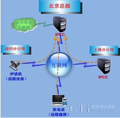客戶采用IPCC-100型的IPCC系統(tǒng)組建一套分布式呼叫中心系統(tǒng)。它不僅實(shí)現(xiàn)呼叫中心功能,又完全取代傳統(tǒng)PBX作為核心的通信系統(tǒng)?蛻艨偛咳萘繛50門分機(jī),30門用于呼叫中心坐席,20門用于辦公線路用。另有2個(gè)分支機(jī)構(gòu)分別配置一臺(tái)IX-50和IE-62,作為分公司的電話交換設(shè)備。通過互聯(lián)網(wǎng)與總部的IPCC點(diǎn)對(duì)點(diǎn)對(duì)接,實(shí)現(xiàn)內(nèi)部互通免費(fèi)。