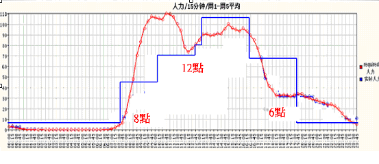 大家看到圖一中紅色的線,就是一天里面電話進來的數(shù)量,藍色的線是安排的人力。可以清楚看到:早上8點一開始,電話就一直進來;中午來電的客戶開始去吃飯,電話就開始下滑;然后等到客戶吃完中飯,電話又開始進來,下午又出現(xiàn)另外一個高峰;一直到5點以后又開始下滑,6點以后電話相對就少很多。