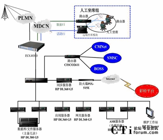 平臺核心話路接入集在中毅航通信iSX4000智能業(yè)務(wù)交換機(jī)的IVR自動語音平臺,人工坐席平臺通過和系統(tǒng)支撐軟件實現(xiàn)遠(yuǎn)端坐席功能,通過專線中繼與IVR平臺實現(xiàn)話路連接;InterNet與IVR平臺實現(xiàn)數(shù)據(jù)同步。根據(jù)移動交換網(wǎng)傳輸內(nèi)容選擇應(yīng)相的IVR自動語音服務(wù)或人工坐席服務(wù)。