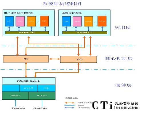 MC是整個(gè)的系統(tǒng)控制核心,其完成對(duì)iSX4000 交換機(jī)的所有控制功能,包括系統(tǒng)配置管理、呼叫控制、媒體網(wǎng)關(guān)控制和媒體資源管理等。應(yīng)用層的業(yè)務(wù)應(yīng)用程序發(fā)起的所有控制命令,通過MC路由到指定的iSX4000交換機(jī)上,并由iSX4000交換機(jī)最終完成指定的操作,而操作的結(jié)果最終通過MC,返回給業(yè)務(wù)應(yīng)用程序。同理,由iSX4000交換機(jī)發(fā)起的控制信號(hào),亦是通過MC來派發(fā)給特定的業(yè)務(wù)應(yīng)用程序,業(yè)務(wù)應(yīng)用程序處理后,通過MC反饋給iSX4000交換機(jī)。