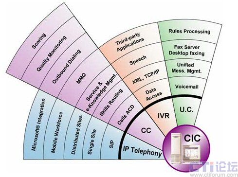 CIC平臺是一套符合呼叫中心營運所需,且有其營運所需模塊的All In One設(shè)備,如數(shù)字交換機、PABX、CTI、IVR、ACD、 Screen Pop、數(shù)據(jù)庫整合、網(wǎng)站整合服務(wù)(Web Call Back、Web Chat、VON、E-mail)、傳真服務(wù)器、傳真自動回復(fù)、Dialer、Scripter、在線錄音...等所有功能,采用CIC平臺的系統(tǒng)比基于傳統(tǒng)PBX的系統(tǒng)更加易于維護。 CIC為企業(yè)體帶來一個功能齊備,技術(shù)人員及值機人員可以自己完全掌握的Call Center系統(tǒng),并且也是一個最上算投資報酬率ROI(Return Of Investment)的解決方案。