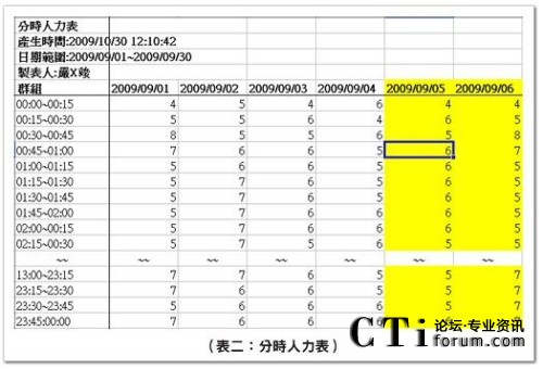 分時(shí)人力表在管理上有重要的地位,用于檢視時(shí)間內(nèi)排定的出席人數(shù),通常是將此數(shù)據(jù)與預(yù)測的話務(wù)需求做比對,檢查排定人力數(shù)與話務(wù)曲線的擬合度。在現(xiàn)場管理時(shí),則用于小休調(diào)度,避免小休人數(shù)過多,使出席人數(shù)降到關(guān)鍵少數(shù)的臨界點(diǎn)下,造成服務(wù)水平大幅跌落的狀況發(fā)生。
