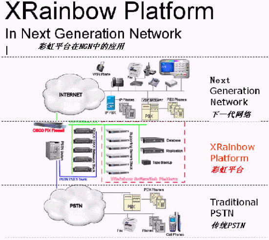 Xrainbow軟交換平臺它是基于SIP協(xié)議、針對中國現(xiàn)有Internet網(wǎng)絡(luò)狀況和現(xiàn)有網(wǎng)路硬件服務(wù)商的VoIP 設(shè)備的特點,為電信運營商和二級/虛擬運營商, 通信系統(tǒng)集成商提供運營于下一代新網(wǎng)絡(luò)(NGN, Next Generation Network)之上的一套集VoIP 語音及信號交換、管理及服務(wù)于一體的電信級系統(tǒng)平臺。X彩虹SIP軟交換系統(tǒng)包括以下的核心服務(wù)器如下認證服務(wù)器、路由服務(wù)器、配置服務(wù)器、功能服務(wù)器、語音郵件服務(wù)器、媒體轉(zhuǎn)發(fā)服務(wù)器和網(wǎng)絡(luò)管理服務(wù)器。我們的系統(tǒng)可以實現(xiàn)多種功能,功能模塊包括:監(jiān)控模塊、計費模塊、管理模塊、話吧模塊、代理商模塊、軟電話模塊、集團功能模塊、電話卡模塊、主叫認證模塊、回撥模塊、批發(fā)計費模塊、電話會議模塊等。