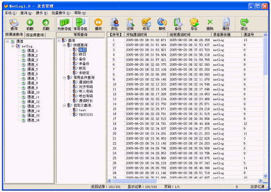 主要是對錄音進(jìn)行管理,分為錄音查詢和錄音操作兩大部分。錄音查詢除了提供常規(guī)的按條件組合查詢外,還提供了人性化的常用查詢,系統(tǒng)已經(jīng)內(nèi)置了很多常用查詢,例如:當(dāng)日查詢,您只要直接選擇當(dāng)日查詢,就可以馬上開始查詢當(dāng)日的所有錄音,減少您每次輸入查詢條件的工作量,并且還可以靈活的自定義常用查詢,充分滿足您的查詢要求。錄音操作提供了方便快捷的操作方式。批量數(shù)據(jù)的處理能力可以讓用戶以最快的速度從煩瑣的工作中解脫出來。詳細(xì)的記錄信息可以滿足所有用戶的要求,特定信息的加入可以滿足特殊行業(yè)的使用,如呼叫中心行業(yè)、服務(wù)臺(tái)、傳呼臺(tái)等。