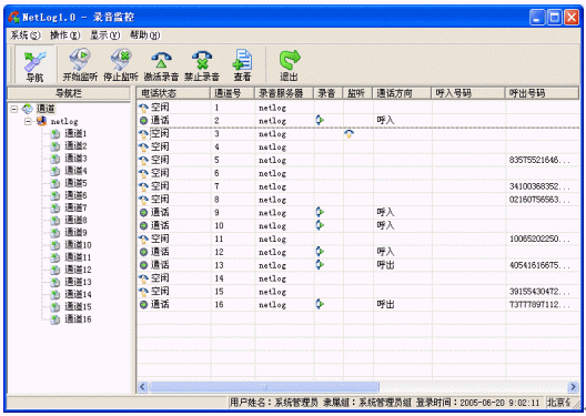 Netlog系統(tǒng)中控制臺(tái)是一個(gè)統(tǒng)一配置和管理的平臺(tái),可以部署在網(wǎng)絡(luò)內(nèi)的任意一臺(tái)主機(jī)上,各個(gè)功能模塊都可以單獨(dú)工作,也可以同時(shí)使用,控制臺(tái)所有模塊可以通過系統(tǒng)導(dǎo)航(ToolBar)來引導(dǎo)啟動(dòng)。用戶可以通過控制臺(tái)操作網(wǎng)絡(luò)上所有記錄服務(wù)、數(shù)據(jù)服務(wù)和文件服務(wù)。控制臺(tái)作為最終用戶終端可以完成用戶的所有操作,設(shè)置每個(gè)服務(wù)器甚至每個(gè)通道的屬性、執(zhí)行各種用戶操作、指定服務(wù)的工作方式、錄音查詢、錄音管理、輸出報(bào)表、排班等?刂婆_(tái)根據(jù)用戶權(quán)限的不同限定用戶的操作,更好的保障了系統(tǒng)的運(yùn)行和語音記錄文件的安全。