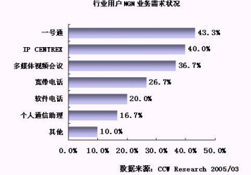 NGN 成為電信運(yùn)營商滿足用戶需求的有力武器。不同的行業(yè)用戶對基于 NGN 推出的電信業(yè)務(wù)表現(xiàn)出了較大的需求差異,例如: IT通信、物流和服務(wù)業(yè)對 IP CENTREX 、多媒體視頻會(huì)議和寬帶電話等業(yè)務(wù)比較感興趣,而政府用戶對一號通等業(yè)務(wù)比較感興趣。不同行業(yè)對業(yè)務(wù)需求具有差異性,這就要求運(yùn)營商基于 NGN 平臺開發(fā)的業(yè)務(wù)要有更大的靈活性,要有突出用戶通信需求的整體解決方案,要能滿足用戶的個(gè)性化需求。