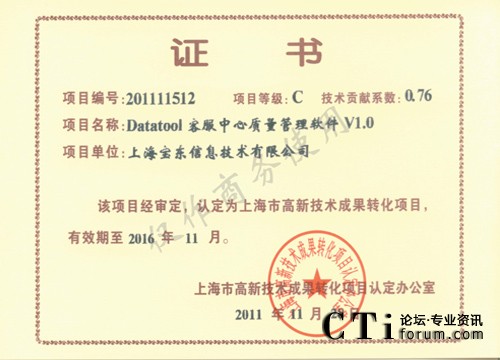 CTI論壇(ctiforum)12月7日消息(記者 張潔):2011年的最后一個(gè)月,寶東公司傳來(lái)又一好消息,公司的開(kāi)發(fā)團(tuán)隊(duì)自主開(kāi)發(fā)研制的針對(duì)呼叫中心客服的質(zhì)檢軟件“Datatool 客服中心質(zhì)量管理軟件(簡(jiǎn)稱DTQM)”經(jīng)過(guò)市高新技術(shù)轉(zhuǎn)化項(xiàng)目認(rèn)定辦公室層層審報(bào)審批,最終經(jīng)審定,被認(rèn)定為市高新技術(shù)成果轉(zhuǎn)化項(xiàng)目。CTI論壇報(bào)道