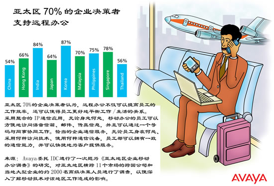 全球領(lǐng)先的企業(yè)通信軟件、系統(tǒng)和服務(wù)供應(yīng)商Avaya公司(紐約證券交易所上市代碼:AV)近日公布了針對整個(gè)亞太地區(qū)關(guān)于遠(yuǎn)程辦公的調(diào)查報(bào)告,結(jié)果表明,亞太地區(qū)70%的企業(yè)高層管理者支持員工遠(yuǎn)程辦公,認(rèn)為可以有效地提高員工的工作效率,進(jìn)而提高企業(yè)的競爭優(yōu)勢。
