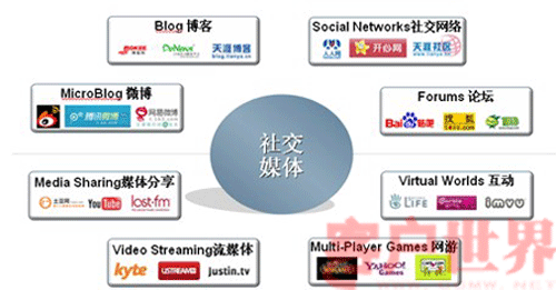 在國外這些網(wǎng)絡(luò)新媒體包括: SNS社交網(wǎng)絡(luò)(如FACEBOOK)、BLOGS博客、WIKI維基(WIKIEPEDIA\WIKITRAVEL、內(nèi)容分享(如圖片分享FLICKR\視頻分享YOUTUBE\社會標簽DEL)、社區(qū)(包括傳統(tǒng)的BBS社區(qū)和新興的3D社區(qū)如第二人生等)和微博(如TWITTER)等。在國內(nèi)也涌現(xiàn)了一批社交媒體,如新浪、騰訊微博,天涯社區(qū)、開心網(wǎng)等。