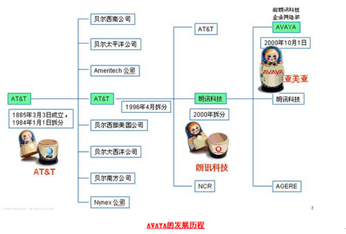 Avaya的歷史最早可以追溯到1885年成立的美國(guó)電話電報(bào)公司(AT&T),AT&T在1994年一分為AT&T、朗訊科技、NCR等三家公司,而Avaya于2000年10月從朗訊科技的企業(yè)通信部門剝離獨(dú)立上市(代碼AV),再后來(lái)即上文中提到的Avaya被兩大私募德州太平洋集團(tuán)和銀湖合伙組成的財(cái)團(tuán)用82億美元私有化。