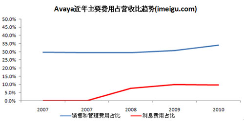 Avaya的成本和費(fèi)用主要由營(yíng)業(yè)成本、銷售和管理費(fèi)用、研發(fā)費(fèi)用、無(wú)形資產(chǎn)攤銷費(fèi)用、利息支出等構(gòu)成。(1)營(yíng)業(yè)成本主要由硬件費(fèi)用、第三方合作伙伴授權(quán)費(fèi)用以及相關(guān)產(chǎn)品和服務(wù)的人力成本組成,2010財(cái)年?duì)I業(yè)成本占營(yíng)收比為57.1%;(2)銷售和管理費(fèi)用定義為銷售和市場(chǎng)活動(dòng)以及管理活動(dòng)相關(guān)的工資薪酬、設(shè)備折舊費(fèi)用等等,2010財(cái)年該項(xiàng)費(fèi)用占比達(dá)30.4%;(3)無(wú)形資產(chǎn)攤銷主要來(lái)自分期攤銷并購(gòu)NES 時(shí)的客戶關(guān)系價(jià)值,2010財(cái)年占營(yíng)收比4.3%。(4)利息費(fèi)用即相關(guān)債務(wù)的利息支出和規(guī)避利率風(fēng)險(xiǎn)敞口的金融工具費(fèi)用,2010財(cái)年占營(yíng)收達(dá)9.6%。
