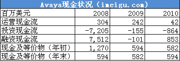 2008、2009、2010財(cái)年Avaya公司運(yùn)營(yíng)現(xiàn)金流分別為3.04億美元、2.42億美元、4200萬(wàn)美元,2010財(cái)年運(yùn)營(yíng)現(xiàn)金流急劇減少因并購(gòu)北電的企業(yè)通信部門(NES)影像所致,截至2010財(cái)年(即2010年9月30日)Avaya公司現(xiàn)金及等價(jià)物為5.94億美元。