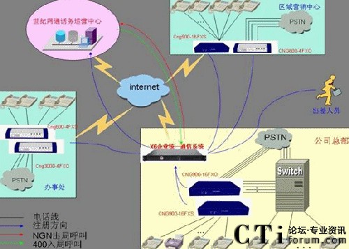 總部現(xiàn)在使用的為傳統(tǒng)PBX設(shè)備,配置為50路外線和200內(nèi)線,分機(jī)為8前綴4位的分機(jī)號(hào)碼,如8001分機(jī)。32個(gè)的辦事處使用電信匯線通或直接的PSTN線路,2個(gè)的區(qū)域營(yíng)銷中心使用匯線通或直接的PSTN線路,2個(gè)分公司使用的小型PBX。總部目前申請(qǐng)了4條2M的ADSL線路做為一個(gè)集合,沒(méi)有固定的IP地址,各個(gè)分公司也多使用ADSL上網(wǎng)或電信的小區(qū)寬帶上網(wǎng)。