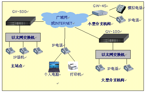 - 分公司:選用一臺4口網(wǎng)關設備,接入到互聯(lián)網(wǎng)絡,通過公共的IP交換中心建立起呼叫連接,實現(xiàn)打電話的功能。模擬了通過網(wǎng)關設備接入PBX(電話程控交換機),如果其它分部也要接入PBX,與此情況類似。(詳見后面的"撥號示例")