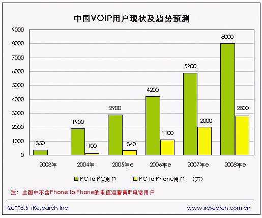 根據(jù)信息產(chǎn)業(yè)部的統(tǒng)計(jì),2005年上半年IP通話時(shí)長(zhǎng)(去話)達(dá)到644.1億分鐘,同比增長(zhǎng)17.4%,據(jù)iResearch預(yù)測(cè),2008年中國(guó)的PC to Phone的VoIP電話用戶將達(dá)到2800萬戶(如圖1)。2004-2005年,中國(guó)IP電話業(yè)務(wù)保持較高速度增長(zhǎng),但增長(zhǎng)率已經(jīng)有所下降,因此中國(guó)IP電話業(yè)務(wù)處于擴(kuò)張期。可以預(yù)見IP電話業(yè)務(wù)仍將保持增長(zhǎng),但增長(zhǎng)率將持續(xù)下降。中國(guó)VoIP市場(chǎng)的特點(diǎn)可以歸納為:使用VoIP技術(shù)的應(yīng)用環(huán)境正在逐步成熟,尚需要迎接質(zhì)量、網(wǎng)絡(luò)帶寬、安全等方面的挑戰(zhàn)。
