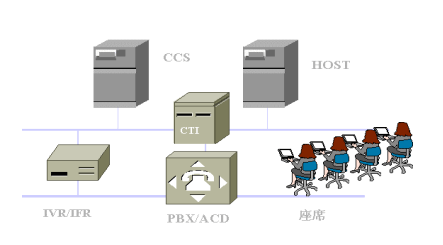 智能化網絡(Intelligent Network)、排隊機(ACD)、計算機語音集成(CTI)、自動語音/傳真響應設備(IVR/IFR)、業(yè)務系統主機HOST、座席(Agent)、信息板(Wall