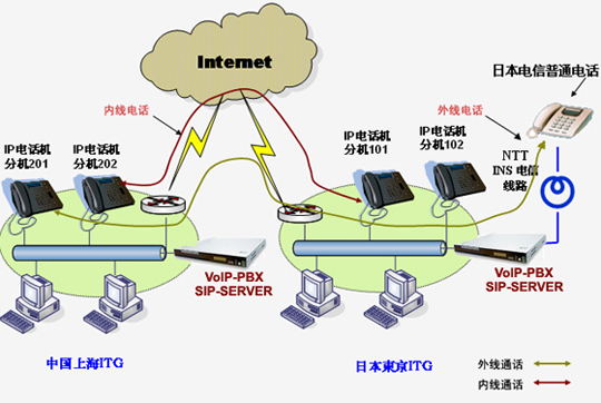 上海愛(ài)吉研發(fā)的VoIP-PBX軟交換系統(tǒng)已經(jīng)成功地在上海愛(ài)吉和日本愛(ài)吉以及日本的客戶(hù)間實(shí)施。目前應(yīng)用上海愛(ài)吉生產(chǎn)的VoIP-PBX產(chǎn)品,可以實(shí)現(xiàn)從上海愛(ài)吉的任意IP電話(huà)機(jī)撥打內(nèi)部分機(jī)號(hào),例如:101,成功實(shí)現(xiàn)從Internet互聯(lián)網(wǎng)接通位于日本東京的日本ITG或日本OKI公司的IP電話(huà)機(jī),而不產(chǎn)生任何的電信費(fèi)用。另外,目前通過(guò)日本的NTTINS 交換機(jī),還實(shí)現(xiàn)了從上海愛(ài)吉的IP電話(huà)機(jī)可以撥打日本方面的任意普通電話(huà),即日本電信范圍內(nèi)的任意普通電話(huà),而僅僅產(chǎn)生從日本ITG到日本其它地方的短途或國(guó)內(nèi)長(zhǎng)途費(fèi)用,而沒(méi)有上海到日本的國(guó)際長(zhǎng)途費(fèi)用。具體的網(wǎng)絡(luò)應(yīng)用圖如下所示: