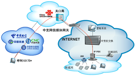 企業(yè)自行從網(wǎng)站上成功申請“企業(yè)商務(wù)通”業(yè)務(wù)后,通過101756*全國統(tǒng)一接入號結(jié)合呼叫中心,當外部對企業(yè)申請的10175*號碼發(fā)起呼叫時,該呼叫通過中國聯(lián)通的線路將話務(wù)指向中寬網(wǎng)信的媒體網(wǎng)關(guān),由中寬軟交換平臺將呼叫送至指定的呼叫中心,由呼叫中心完成相應(yīng)的服務(wù)。另外,當您使用該業(yè)務(wù)外呼時,可以選擇在被叫電話上顯示10175*或隱藏號碼。