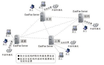 EastFax在國內首次應用中央服務器的方式管理整個集團的傳真。改變以往各個服務器之間一一相連、繁瑣相加的方式,每個服務器只需與中央服務器相連,即加入整個集團傳真網(wǎng)絡。