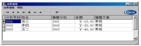 催繳調(diào)度表中的%欠費(fèi)%,用戶可以從計(jì)費(fèi)系統(tǒng)的月報(bào)表中提出(用戶輸入月份,自動(dòng)根據(jù)催繳電話取過來);也可由用戶再次修改(針對(duì)所欠不是一個(gè)月的費(fèi)用),但“刷新”又從從計(jì)費(fèi)系統(tǒng)的月報(bào)表中更新數(shù)據(jù)。