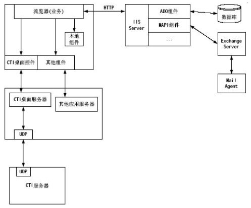 對(duì)于所有的電力業(yè)務(wù)模塊都是在IE瀏覽器上實(shí)現(xiàn),瀏覽器上的應(yīng)用模塊對(duì)WEB Server發(fā)出請(qǐng)求,WEB Server解釋運(yùn)行ASP程序,利用ASP創(chuàng)建數(shù)據(jù)庫組件訪問系統(tǒng)的數(shù)據(jù)庫信息;利用嵌入WEB頁面的CTI桌面控件可以實(shí)現(xiàn)CTI集成功能,如:建立呼叫、應(yīng)答呼叫、席間轉(zhuǎn)移、人工自動(dòng)切換等等;利用其他嵌入WEB網(wǎng)頁的組件實(shí)現(xiàn)其他擴(kuò)展功能,如:Exchange