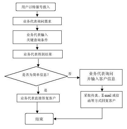 系統(tǒng)自動(dòng)報(bào)受理人員工號(hào),人工交互式受理方式。受理人員根據(jù)用戶要求從服務(wù)質(zhì)量標(biāo)準(zhǔn)數(shù)據(jù)庫、電費(fèi)數(shù)據(jù)庫和其他相連的數(shù)據(jù)庫查詢資料,然后通過語音方式播報(bào)資料或送到用戶指定的傳真機(jī)或其他終端設(shè)備上。主要內(nèi)容如下: