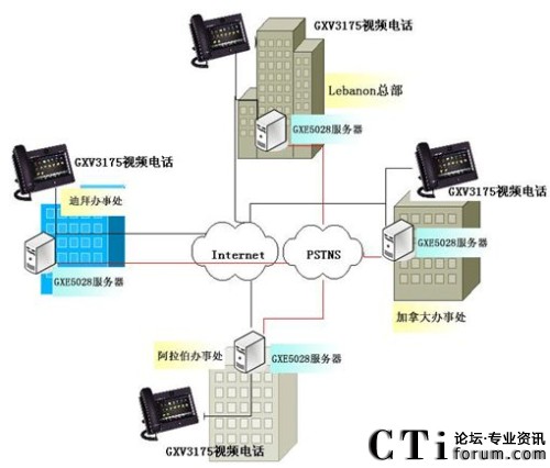 在Tabbara公司的全球四個辦事處分別安裝潮流網(wǎng)絡的GXE5028 IPPBX服務器或者其他的SIP Sever通信平臺,GXE5028 IP PBX支持語音信箱,郵件和其他通信功能應用,每一臺GXE5028最大限度地支持分布全球辦事處的所有通信賬號同時連接到同一網(wǎng)絡中,終端連接IP電話,IP視頻電話以及IP視頻監(jiān)控攝像機作為語音/數(shù)據(jù)的輸入輸出,當然IP PBX也可通過網(wǎng)絡連接到VoIP服務器中間位置的SIP中繼。潮流網(wǎng)絡的GXV3175多媒體觸摸屏視頻電話,支持標準的SIP協(xié)議,先進的H.264/H.263/H.263+視頻壓縮標準,寬大的7寸彩色觸摸顯示屏實現(xiàn)溝通面對面的零距離交流,以及撥打網(wǎng)絡攝像機觀看監(jiān)控現(xiàn)場。潮流網(wǎng)絡的GXV3662_HD高清防暴半球IP攝像機和GXV3651_HD IP攝像機,分別安裝在辦事處關鍵位置,365天,每周24*7個小時進行實時監(jiān)控,作為企業(yè)財產(chǎn)和人員安全的保障。方案中,各分支機構之間通話免費,撥打分支機構所在地其他電話按市話費算,出差人員使用IP電話與公司內(nèi)部通話免費。