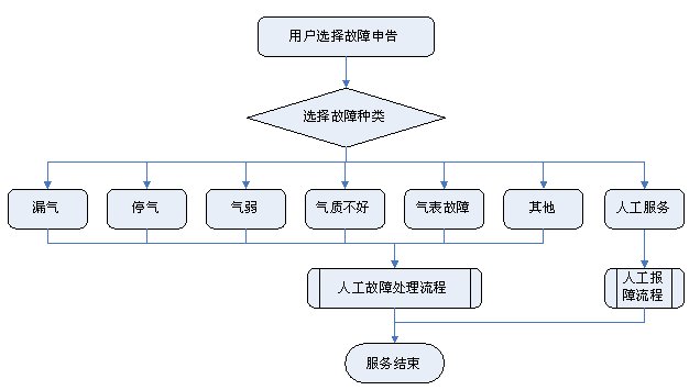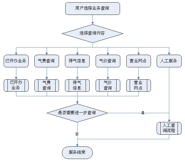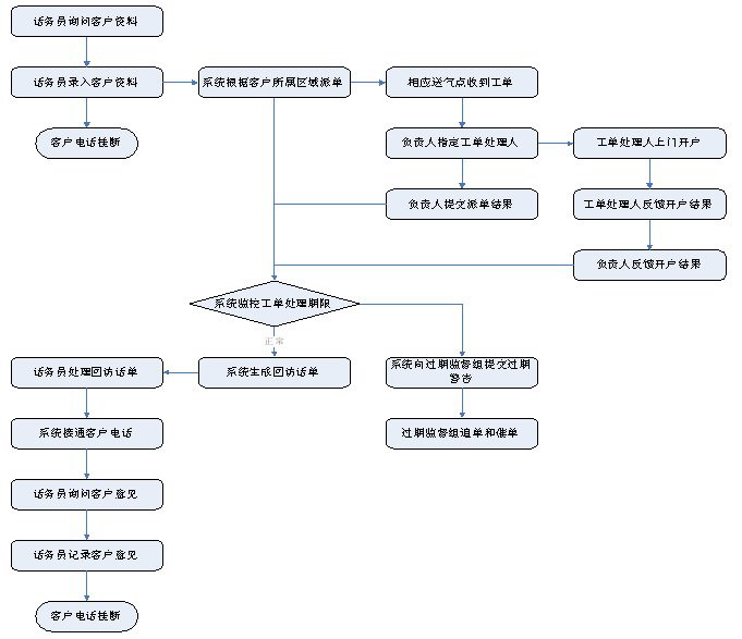 1)業(yè)務(wù)咨詢:用戶通過人工、自動語音等方式咨詢有關(guān)政策法規(guī)、資費標準、用氣常識、報裝方法等,系統(tǒng)以語音、傳真、Email、短消息等方式回復客戶。