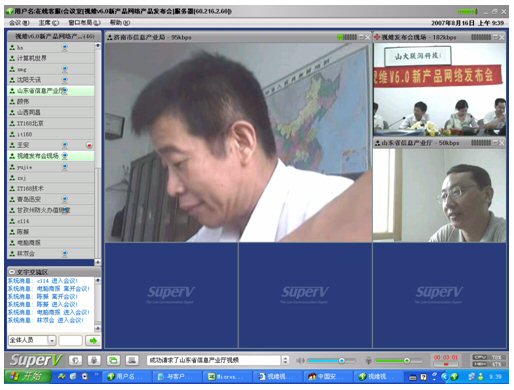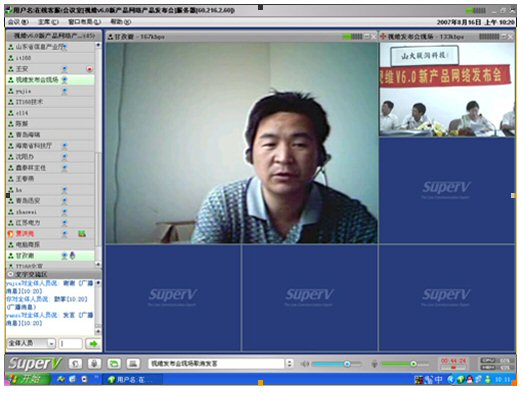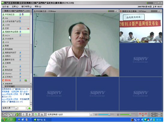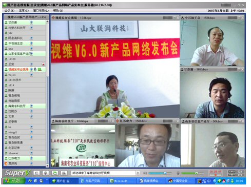 2007年8月16日,視維視頻會議V6.0新產(chǎn)品網(wǎng)絡(luò)發(fā)布會在美麗的泉城濟(jì)南舉行,山東省信息產(chǎn)業(yè)廳、濟(jì)南市信息產(chǎn)業(yè)局的領(lǐng)導(dǎo)、山東省電信等上級主管部門領(lǐng)導(dǎo),視維產(chǎn)品新老用戶和有視頻會議需求的潛在客戶,國內(nèi)外合作伙伴,IT168、中國計(jì)算機(jī)報、電腦商報、C114、支點(diǎn)網(wǎng)、計(jì)算機(jī)世界、CTI論壇、投影時代等國內(nèi)知名媒體100多人參加了這次網(wǎng)絡(luò)發(fā)布會。在此次會議上,山大聯(lián)潤公司通過視頻會議與各地與會者進(jìn)行了良好的溝通,同時這次發(fā)布會開創(chuàng)了用視頻會議發(fā)布新產(chǎn)品的先河。