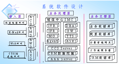平臺除支持傳統(tǒng)的電話和傳真接入方式之外,還支持短消息方式(用于客戶通知),以后通過擴(kuò)展各種接入網(wǎng)關(guān)(例如尋呼網(wǎng)關(guān))和內(nèi)容服務(wù)器(例如WWW、E-Mail、WAP等),平臺還支持WAP、WEB、E-Mail、等多種多媒體的接入方式。